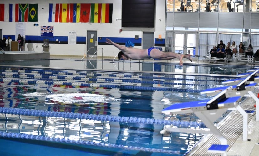 Lindsey Wilson University student Lorenz Hof ’29 of Stadtallendorf, Germany, launches into his winning belly flop on Thursday, Oct. 23, in the Doris and Bob Holloway Health & Wellness Center natatorium.