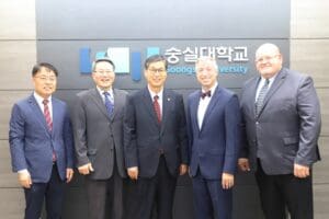 Photo: From left, members of the administration from Soongsil University and Campbellsville University, who recently met to discuss a partnership and opportunities for academic collaboration: Jinhee Choo, Dean of the Office of Secretaries (Soongsil University); Hae Kwon Kim, Head Chaplain (Soongsil University); President Younjai Lee (Soongsil University); President Joseph Hopkins (Campbellsville University); and Peter Thomas, Assistant Vice President for Global Relations (Campbellsville University).