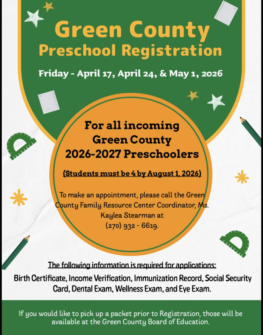 Green County Preschool is excited to welcome new students for the 2026-27 school year! Registration will be held on the following Fridays:
