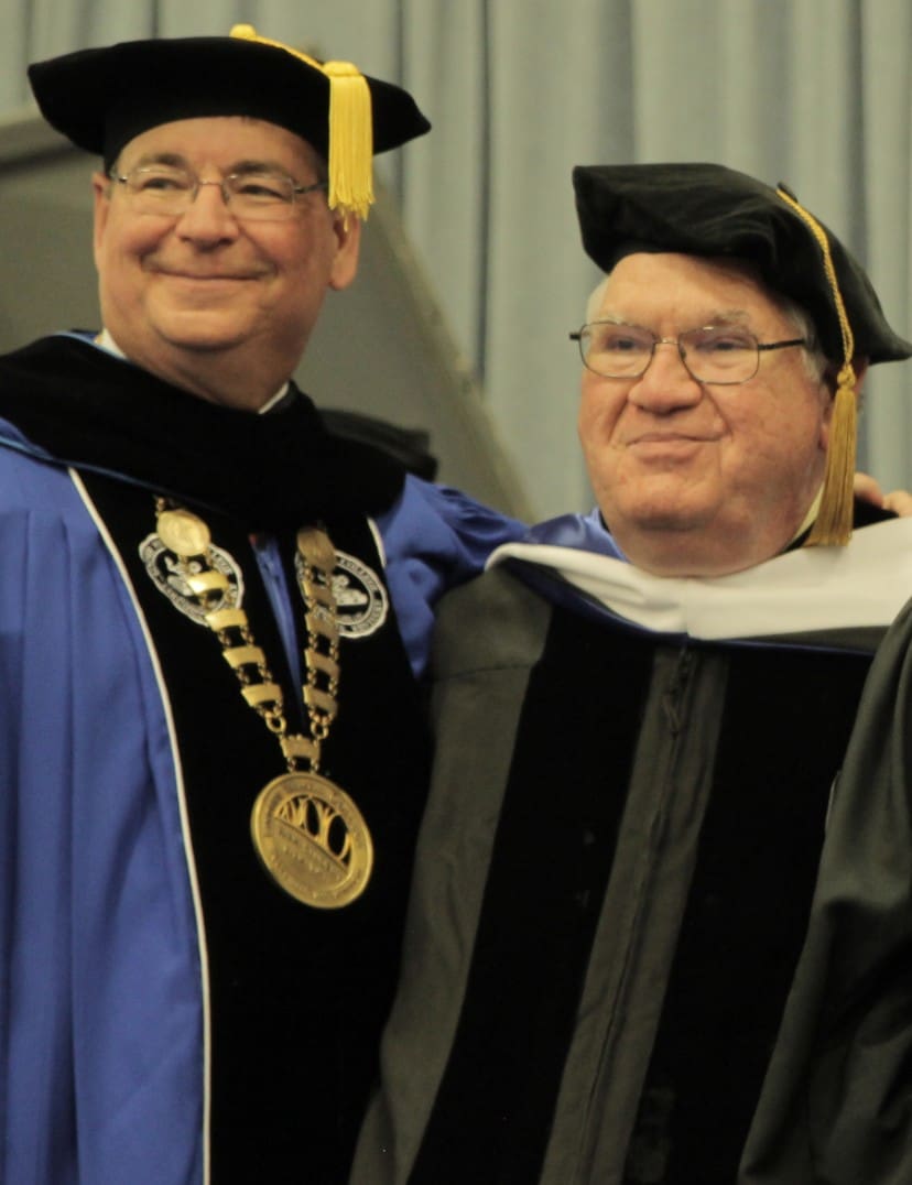 Former Lindsey Wilson University Director of Library Services Phil Hanna, right, pictured with Lindsey Wilson President William T. Luckey Jr. in 2017. Hanna was involved with the Lindsey Wilson Cultural Affairs Series from 1996 until his retirement in 2017, serving as the series chair for all but four of those years. The university has renamed the series the Phil Hanna Cultural Affairs Series.
