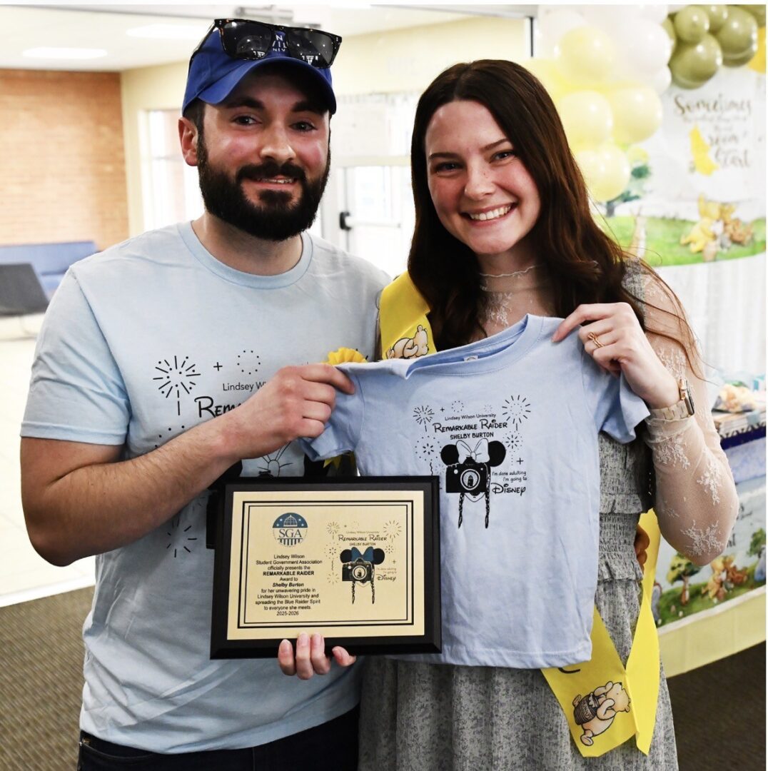 Lindsey Wilson University Assistant Director of Public Relations and Media Producer Shelby Burton and her husband, Chase, display the Remarkable Raider award and commemorative newborn T-shirt she was presented by the Lindsey Wilson Student Government Association on Friday, March 20, in the Doug and Betty Jean Moseley Auditorium of the Norma and Glen Hodge Center for Discipleship. The Burtons are expecting their first child, a son, in June.