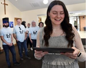 Lindsey Wilson University Assistant Director of Public Relations and Media Producer Shelby Burton wipes a tear from her eye as she reads the inscription on the Remarkable Raider award presented to her by the Lindsey Wilson Student Government Association on Friday, March 20, in the Doug and Betty Jean Moseley Auditorium of the Norma and Glen Hodge Center for Discipleship. Looking on are, from left, Lindsey Wilson Student Government Association members Whitley Gibson ’27 of Edmonton, Kentucky, and Jordan Roberts ’27 of Liberty, Kentucky, and Burton’s husband, Chase.