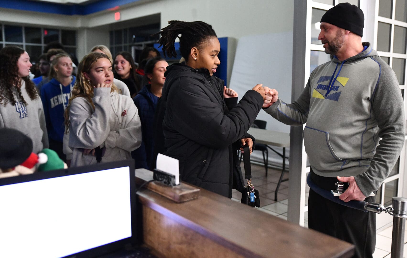 Lindsey Wilson University Dean of Students Chris Schmidt welcomes Saniyah Shelton ’28 of Central City, Kentucky, with a fist bump to the fall Midnight Breakfast on Tuesday, Dec. 9, in the Roberta D. Cranmer Dining & Conference Center. A total of 482 LWU students attended the semiannual late-night event.