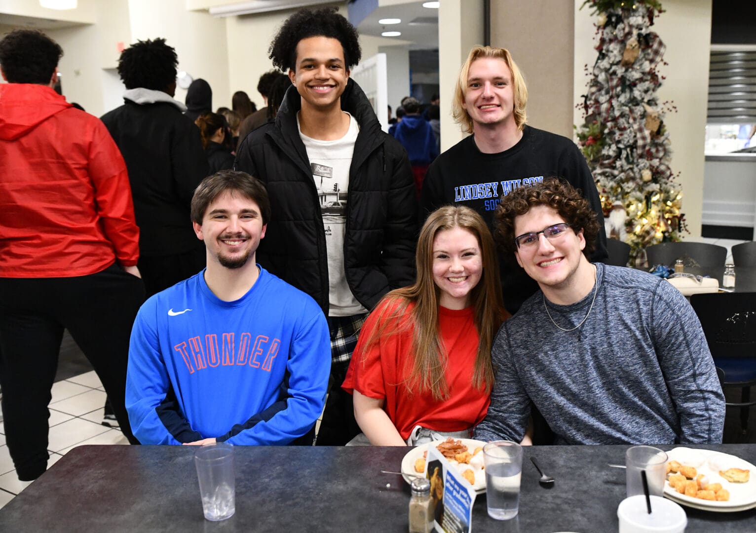This quintet of Lindsey Wilson University students were among the 482 who attended the university’s semiannual Midnight Breakfast on Tuesday, Dec. 9, in the Roberta D. Cranmer Dining & Conference Center. Seated, from left: Braxten Davidson ’27 of Hazard, Kentucky; Jay Woodall ’27 of Somerset, Kentucky; and Connor Wilhoit ’27 of Campbellsville, Kentucky. Standing, from left: Tezon Mitchell ’27 of Campbellsville, Kentucky, and Zachary Hite ’27 of Hodgenville, Kentucky.