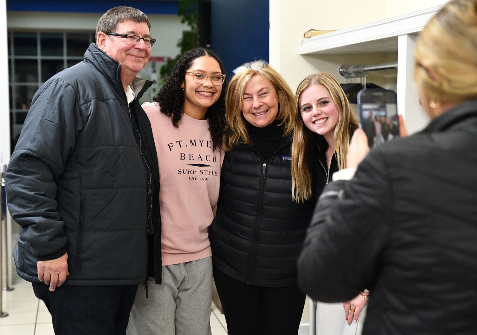 Lindsey Wilson University President William T. Luckey Jr. and First Lady Elise Luckey pose for a picture with students K’Asia Palmer ’27 of Owensboro, Kentucky, second from left, and Kaiden Rodgers ’28 of Paducah, Kentucky, at the university’s semiannual Midnight Breakfast on Tuesday, Dec. 9, in the Roberta D. Cranmer Dining & Conference Center.