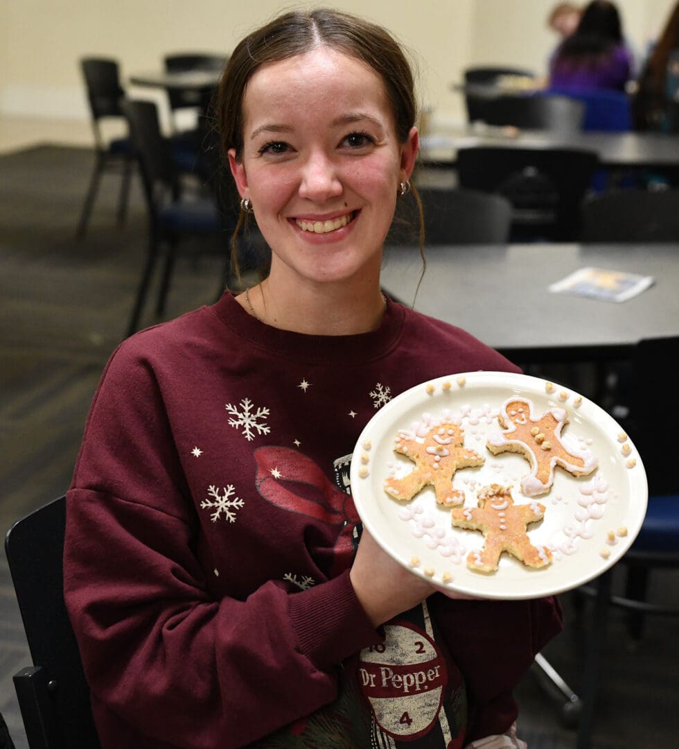 Lindsey Wilson University student Sadie Kemp ’26 of Columbia displays this fall’s “pancake art” — a trio of gingerbread men — at the university’s semiannual Midnight Breakfast on Tuesday, Dec. 9, in the Roberta D. Cranmer Dining & Conference Center.