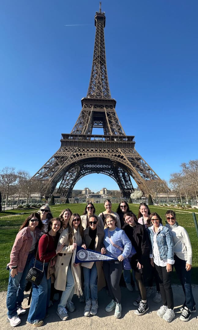 Students and faculty members of the Lindsey Wilson University nursing program stand near the Eiffel Tower while on a day trip to Paris during their study-abroad trip to London and Paris over the university’s spring break.
