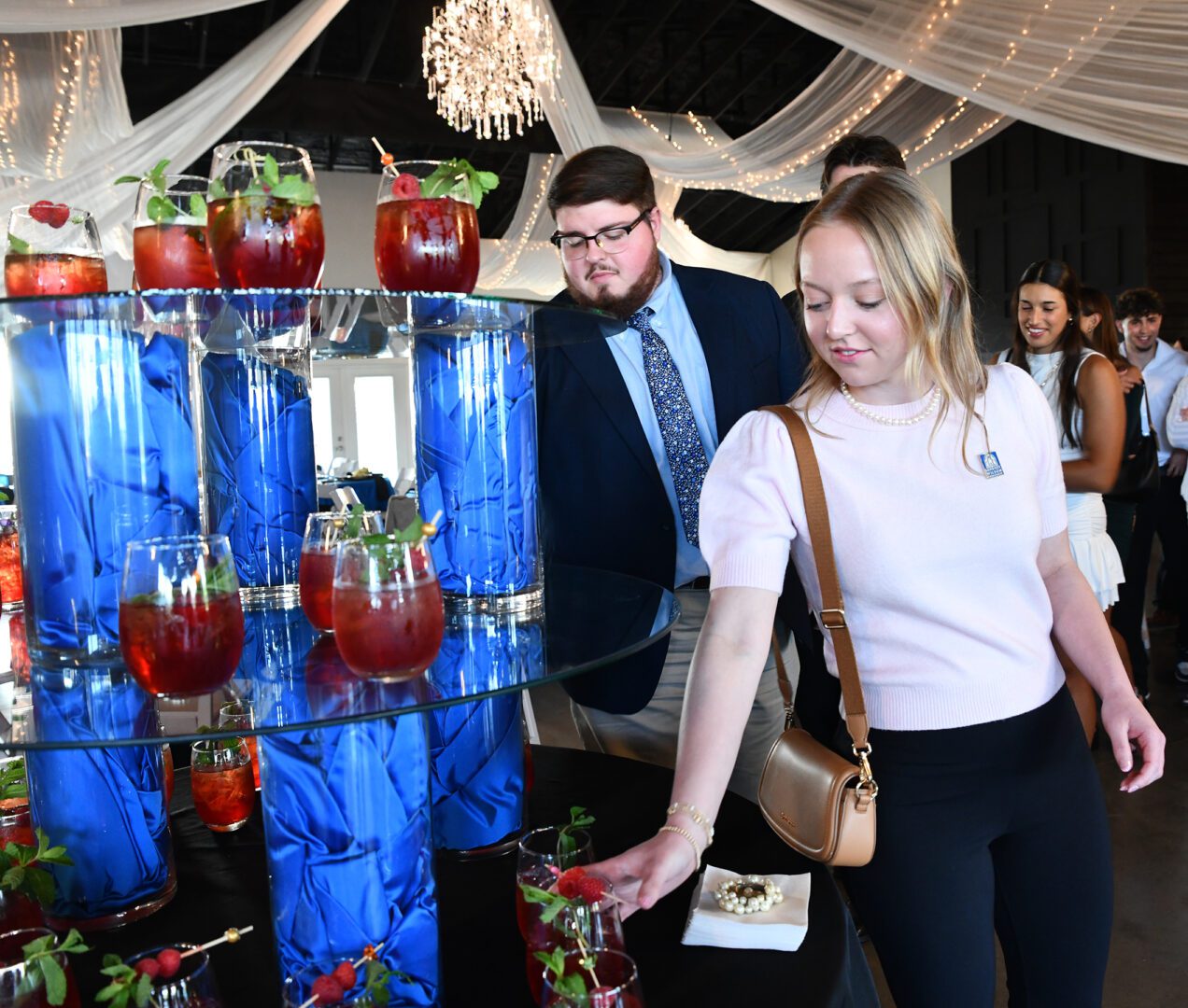 Lindsey Wilson University students Seth Ousley ’26 of Lancaster, Kentucky, and Whitley Gibson ’27 of Edmonton, Kentucky, reach for a mocktail during the Lindsey Wilson School of Business and Communication business dinner etiquette event, held Tuesday, March 31, at Swan’s Landing in Taylor County, Kentucky.