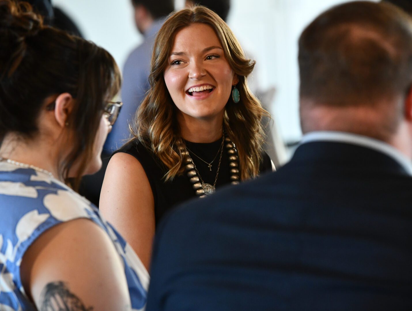 Lindsey Wilson University student Paisley Bolin ’26 of Somerset, Kentucky, practices the art of dinner conversation during the Lindsey Wilson School of Business and Communication business dinner etiquette event, held Tuesday, March 31, at Swan’s Landing in Taylor County, Kentucky.