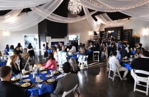 The evening opened with business and communication professors teaching students the subtle art of business networking during a happy hour of mocktails and hors d’oeuvres on a patio. Then they moved to an indoor business dinner, where students were instructed how to navigate a place setting as well as a table conversation.