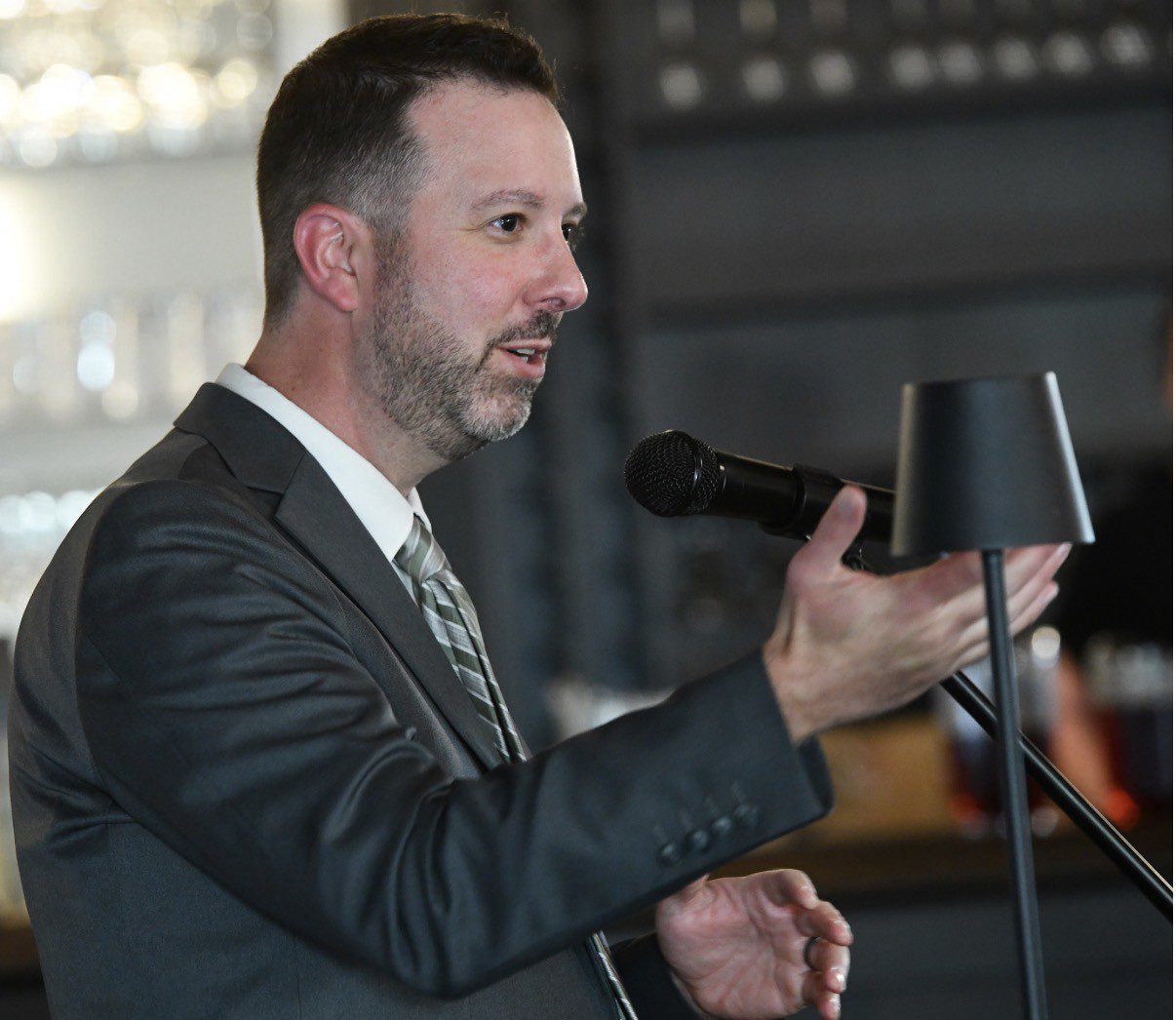 Lindsey Wilson University School of Business and Communication Dean Benson Sexton ’04 welcomes students to the school’s business dinner etiquette event, held Tuesday, March 31, at Swan’s Landing in Taylor County, Kentucky.