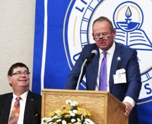 Adair County native Michael T. Neal ’88 delivers the keynote address at the Lindsey Wilson University Fall Trustee Appreciation and Endowed Scholarship Luncheon, held Friday, Oct. 24, in the Roberta D. Cranmer Dining & Conference Center. At left is Lindsey Wilson President William T. Luckey Jr.
