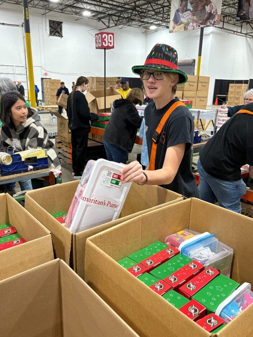 Evan LaBarge scans the boxes so that individuals can track which nation or country their box might travel to. He has been a regular at the processing center since he turned 13 years of age.