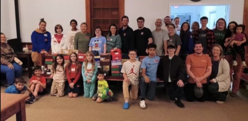Members of the Sparksville Baptist Church enjoyed packing shoebox gifts this year. Pictured are back row: Cindy Newman, Michaela Newman, Ellie Benson, Abigail McCosley, Naoma McCosley, Roseanna McCosley, Lindsey Harper, Mark Harper, Zach Morgan, Tim Morgan, Isaiah Morgan, Felicia Morgan, Ava Morgan, Grace Morrison, Dorinda Morrison, Caleb Morgan, Tasha Padgett, Leor Young, and Niya Young. Front row: Nathan Young, Avi Young, Sophia Durbin, Evie Morgan, Shilah Durbin, Logan Young, Sawyer Padgett, Nathan McCosley, Jonah Morgan, Jeremy Durbin and Hanna Durbin. Several members from the church plan to attend the processing center in Boone, North Carolina to volunteer again this year.